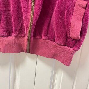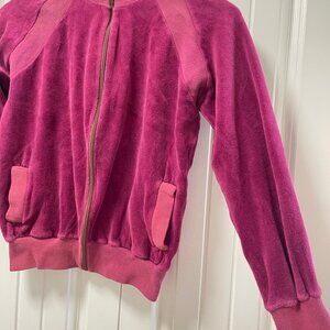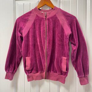 This retro gem brings major vintage Euro flair. Made from a cozy cotton/nylon terry blend, it features a bold berry tone with blush pink ribbed accents and a flattering bomber fit. The perfect throw-on jacket for that Y2K, sporty-chic look.