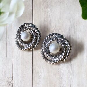 Vintage Twisted Knot Circular Silver tone Pearl Pierced Earrings.