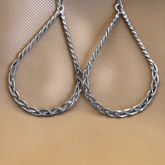 These earrings have a cool teardrop shape made of shiny silver that's twisted like a rope.