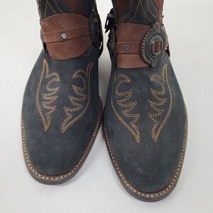 Vintage Two-Tone Cowboy Boots harness buckle black brown heel western cowgirl