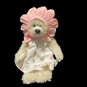 Susannah is a scruffy, brown bear with brown and black button eyes and a black embroidered nose with black stitching for her mouth. She has jointed arms and legs with beige paw pads and black stitching for her toes. She wears a white dress covered in a yellow, floral pattern and a yellow flower bonnet.