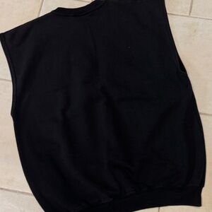 In excellent condition, made in the USA - mid weight fleece with ribbed elasticized bottom and finished hem cut-off sleeves.
