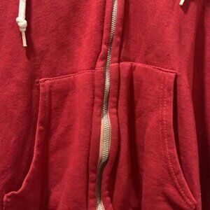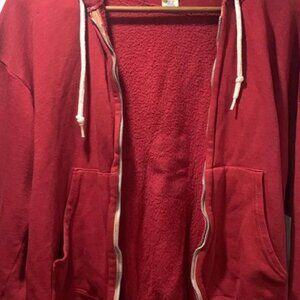 Marooon red hoodie with a full zip closure, easy to layer over a t shirt or sweater.