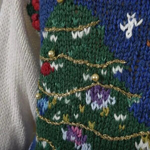 Embellished detailing on sweater including pearls on Christmas tree, knit balls, metallic gold thread on Christmas tree