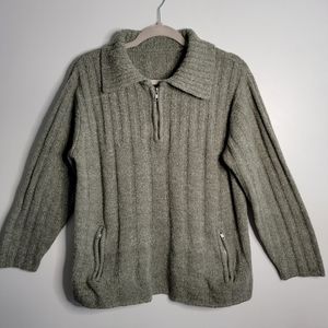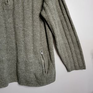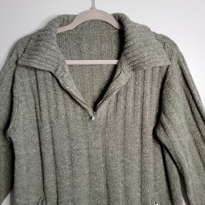 This pullover is super soft and cozy. It is a sage green with a zipper at the collar. Materials are listed at the bottom of the measurements image. This sweater is in amazing condition with no rips or stains.