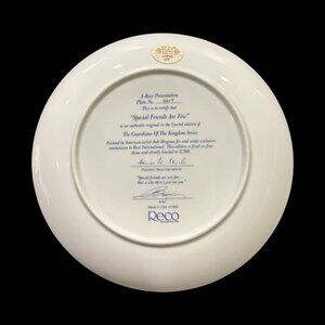 Bring a touch of magic to your home with this enchanting vintage unicorn collector plate, titled “Special Friends Are Few.” This beautifully illustrated porcelain plate features a tender scene of a young child nestled beside a majestic unicorn, surrounded by swirling blues, florals, and shimmering gold trim.