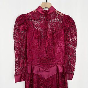 Vintage Union Made 80s Lace Puff Poof Sleeve Satin Maxi Dress Princess Victorian