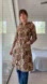 Vintage hooded 3/4 sleeve zip coat with zipper details. Brown geometric patchwork designs over a cream base. Lined. No materials or size tag, but feels like it could be acrylic or a blend with an acetate lining. All pockets are functional!