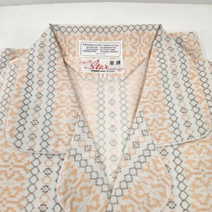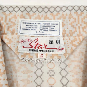 Vintage pajama set with top and bottom, made in China by a company called Star. Probably 1970s or 80s manufacture. Material is a poly/cotton blend with no stretch.