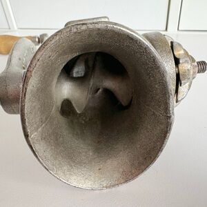 Very old, Classic, sturdy, and built to last! This Universal No. 1 hand-crank meat grinder is perfect for grinding meats, nuts, or making homemade sausage. Cast iron with a smooth wooden handle and a secure table clamp. A great find for vintage lovers and home cooks