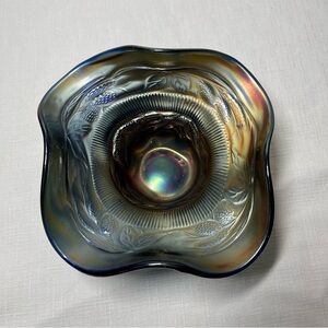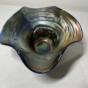 Antique Fenton Peacock Feather Tail Blue Carnival Glass Wave Bowl, dating back to the early 20th century.
