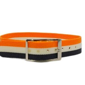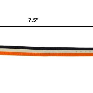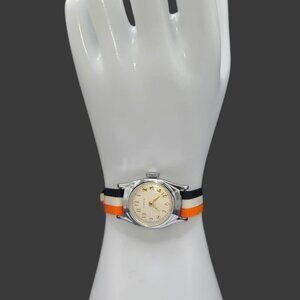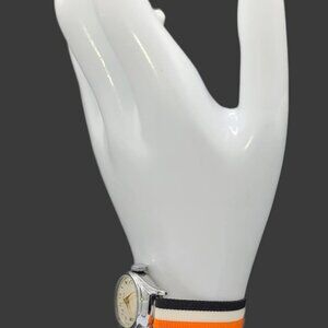 Vintage nylon sport band/strap, 12mm wide x 7.5" adjustable down. Black, orange and white striped one piece watch strap with silver buckled closure. Unused-bought out store inventory. Nylon material. Comes in many colors. See other ads. Watch for demonstration only.
