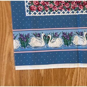 This vintage fabric panel features a swan garden scene surrounded by floral and lattice designs. Ideal for quilting, sewing, or crafting projects.