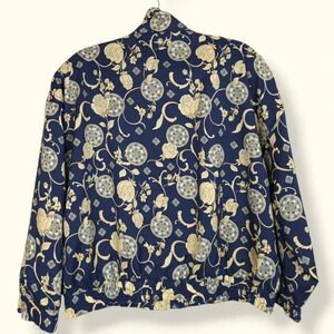 This vintage windbreaker jacket by VIPetites is made of polyester inside and out. The exterior features yellow detailed floral pattern with a navy-blue background. The jacket has an elastic bottom, elastic cuffs, a front zip closure, 2 front pockets, and padded shoulders. The shoulder pads may need some repositioning, but the jacket is in good condition overall.