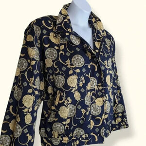 This vintage windbreaker jacket by VIPetites is made of polyester inside and out. The exterior features yellow detailed floral pattern with a navy-blue background. The jacket has an elastic bottom, elastic cuffs, a front zip closure, 2 front pockets, and padded shoulders. The shoulder pads may need some repositioning, but the jacket is in good condition overall.