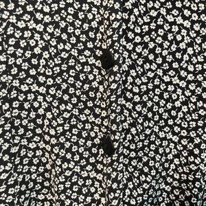 Keywords: floral dress, long sleeve dress, button-down dress, V-neck dress, A-line dress, knee-length dress