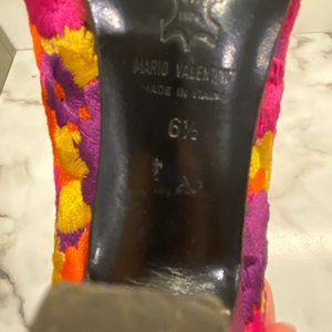 Pink, orange, purple and yellow floral pattern with burgundy suede piping and heels. Fabric all in mint condition.