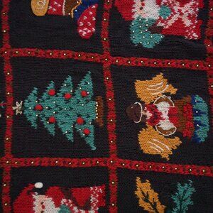 This Vintage Valerie Stevens Christmas sweater is full of festive charm, designed in a patchwork-style layout featuring classic holiday icons. Each square showcases something different—reindeer, decorated trees, angels, snowmen, and bright seasonal accents—brought to life with colorful yarn, textured knitting, and tiny gold bead details. The black knit base makes the bold reds, greens, and golds stand out beautifully, creating a piece that feels cheerful, nostalgic, and perfect for the holiday season.