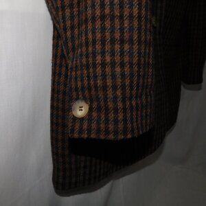 This beautiful Vintage Van Heusen For Her Womens Medium Brown Black Check Single Breast Blazer is in great clean condition. Blazer Shell is 40% Polyester , 30% Acrylic , 25% Wool - 5% Other fabric. Lining is 100% Polyester. Features 2 Front Open Pockets. 2 Front Buttons. Lightly padded shoulders (padding on the inside of lining ). Roll cuff of sleeves for a more casual preppy look. Dry Clean Only,.