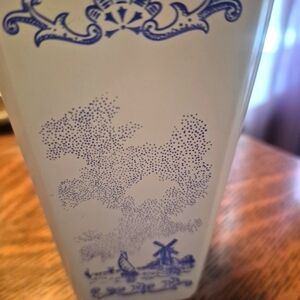 Elegant white bottle with blue windmill design. Perfect for home decor.