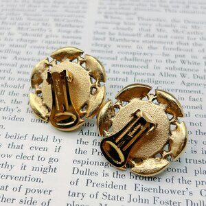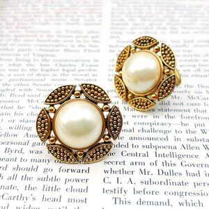 Each features a large faux pearl center with gold-tone leaf details. They are weighty and well-made, with a bold mid-century look.