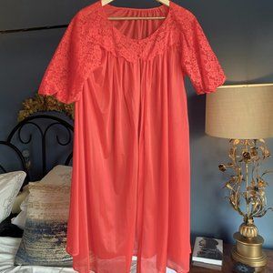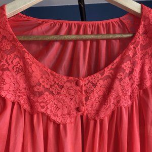 1950s vintage coral red peignoir from Vanity Fair. No tags but it came with a matching negligee that I already sold. Fit is pretty open, can easily fit up to a L. Buttons up at chest, lace puff sleeves. Great vintage condition. Cat friendly, nonsmoking home.