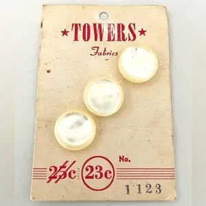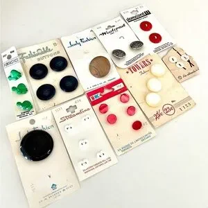 Vintage assortment of original dead stock buttons on cards. You will receive all 10 cards with 29 buttons made of plastic, one wood, two metal and 3 small oyster shell. All in excellent condition. Smoke free, pet free home.
