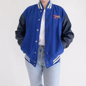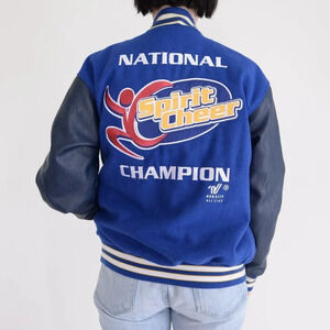 Vintage Varsity Navy Spirit Cheer 15% Wool Button Down Varsity Bomber Jacket S