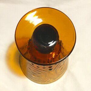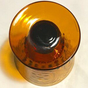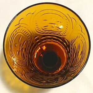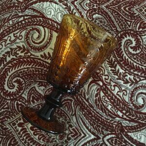 Excellent preowned vintage condition, amber glass goblet with 'hobbs' patterning and folksy variation on the fleur-de-lis. No chips or scratches or crazing.