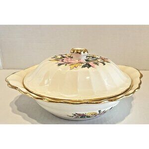 Offered for sale is a charming vintage covered vegetable dish in the elegant Monsoon Regency pattern. This piece is marked Earthen Sovereign Canada and features a cream base with floral detailing and gold trim.