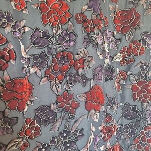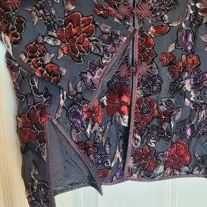 This lined jacket has flowers that are velvet with a metallic outline. there are snap buttons and decorative fabric buttons on top.