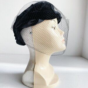 This vintage black velvet satin pillbox hat with mesh overlay is a stunning choice for any special occasion.