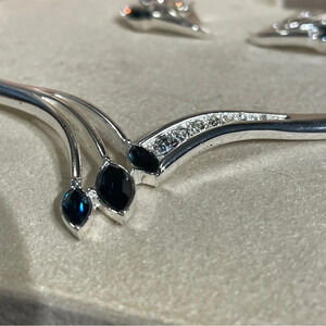 Very delicate and lovely signed Vendome necklace and pierced earring set in original box.Blue sapphire and clear crystal rhinestones are set in a high-polished silver-tone setting. This set is in excellent condition and appears unworn. The box is also in excellent condition. Circa: 1990s