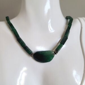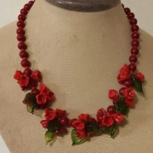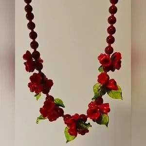 Vintage Venetian/Czech? Red Flowers and Green Leaves Handblown Glass Necklace