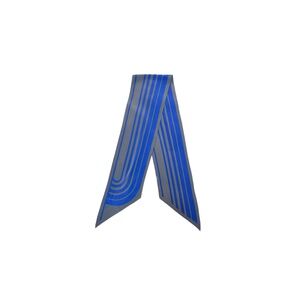 This sleek vintage Vera scarf features a bold geometric stripe pattern in vibrant cobalt blue and gray. The long, narrow cut makes it perfect for styling in a bow, wearing as a headscarf, or tying around a handbag for a modern accent. The fabric is silky and lightweight (fabric composition label missing, so silk cannot be confirmed).