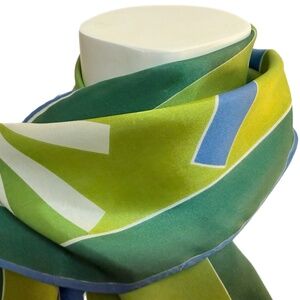 This beautiful vintage Vera Neumann scarf features a bold and graphic floral geometric print in fresh shades of green, blue, and white. Crafted in Japan from 100% acetate, it has a smooth, silky feel and a gorgeous drape. The elongated rectangular shape makes it versatile for wearing as a neck scarf, headscarf, or even tied around a bag handle. A true mid-century design statement piece for any collection.