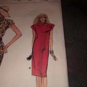 Very Easy Vogue sewing pattern for chic dresses. Includes a leopard print and a red dress design.