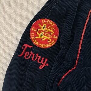 Men’s XL Pit to pit 25” Length 28” Navy with red and white No tags, material is corduroy cotton with a nylon lining, two pockets D-Day memorial patch Zipper and snap closures Preowned condition some fading throughout please see photos Please be aware that all preowned items will usually show a few signs of wear or fading due to age, but anything visible such as stains, holes, fraying etc will be noted