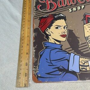 Retro-style metal sign featuring a tattooed woman holding clippers.