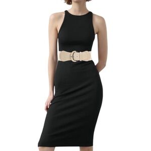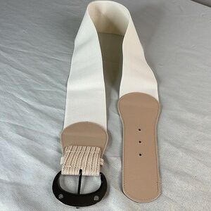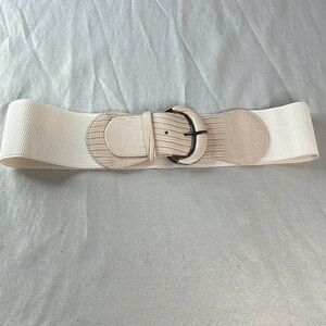 Women’s cream and tan Vintage 80’s Vibe Wide Stretchy Snake Skin Faux Leather Belt with Pewter Look buckle.