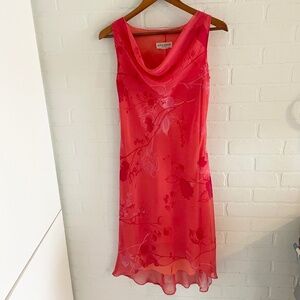 Chic midi dress with striking red and pink hues. Ideal for stylish outings.