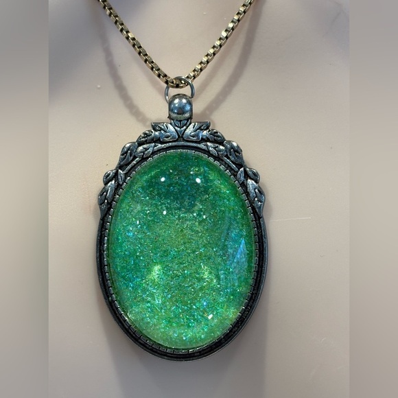 This pendant necklace features an oval-shaped, iridescent green centerpiece with embedded glitter or mica flakes, giving it a shimmering effect. The setting is an antique-style metal frame with intricate leaf-like details, suggesting a vintage or Victorian-inspired design
