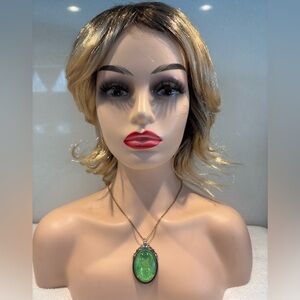 Beautiful pendant necklace featuring a shimmering green centerpiece. The setting has an ornate, vintage-style metal frame