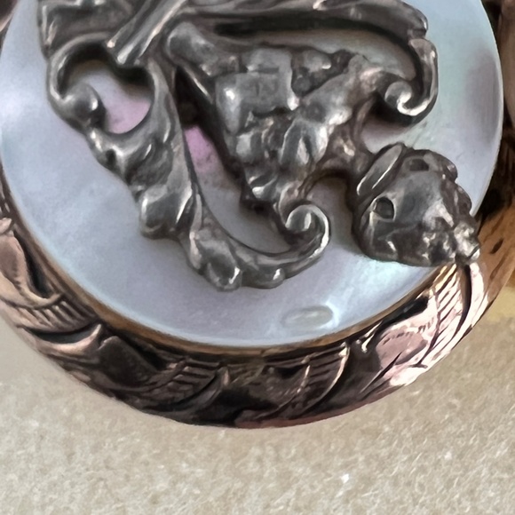 Very rare vintage Victorian Revival heraldic metal fleur de lis on the mother of pearl screw back earrings. the is a small dent on the mother of pearl on the top( hard to notice) , please refer to the pictures.