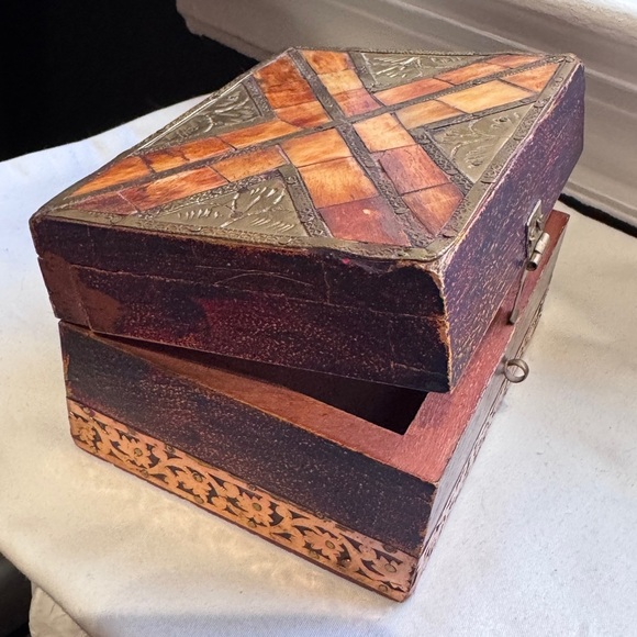 “Timeless and refined, this vintage wooden jewelry box brings a touch of old-world sophistication to modern living. Its intricate patterns and warm tones highlight the craftsmanship of a bygone era, while the secure latch keeps your valuables safe in style. More than storage, it’s a statement piece—an elegant nod to heritage and beauty.”