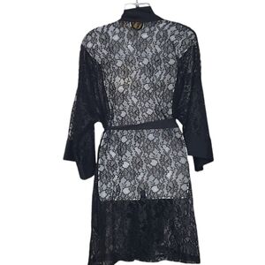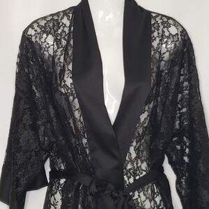 Vintage Victoria's Secret Lace Robe Satin Trim O/S Black Self Tie Belt Women's