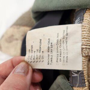 Neutral green and beige tones. Has thin shoulderpads.