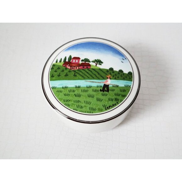 The idyllic rural scenes were painted in 1980 by Gérard Laplau, a French artist who was instrumental in establishing the popularity of naive art. This lovely little candy box is in excellent vintage, preowned condition. It would be perfect for holding your precious rings at your bedside.