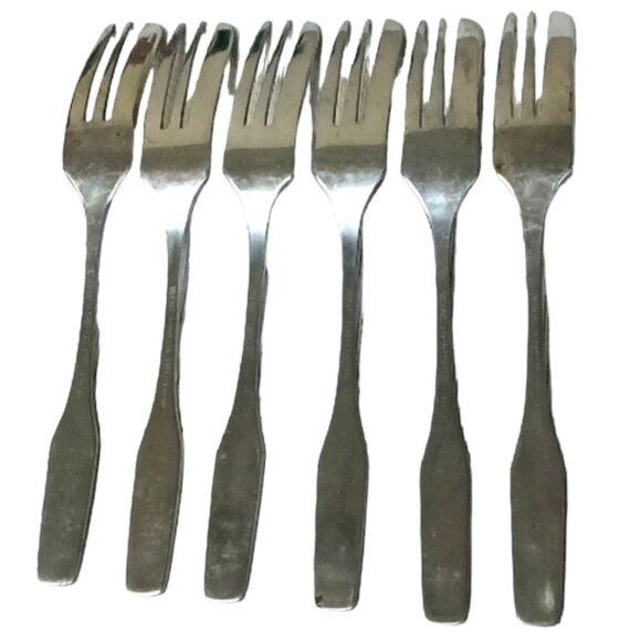 This vintage set of six dessert pastry forks is marked, 'Viners International Stainless Steel Empire on the back of the fork shafts, and SHAPE on the back of the handle. They are in very good condition and each item has a length of 6''.