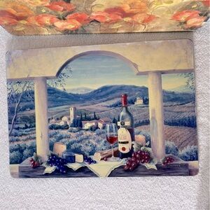 Set of placemats featuring a scenic vineyard design. Includes wine, grapes, and a picturesque landscape. Perfect for adding elegance to your dining table.